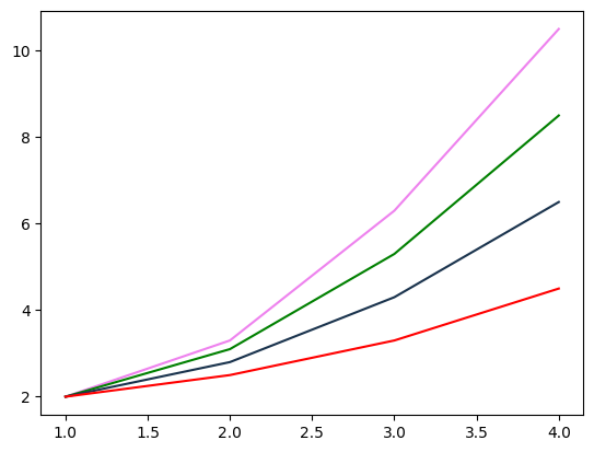 plt.plot([1,2,3,4], [2.0, 2.8, 4.3, 6.5], color=(0.1, 0.2, 0.3))