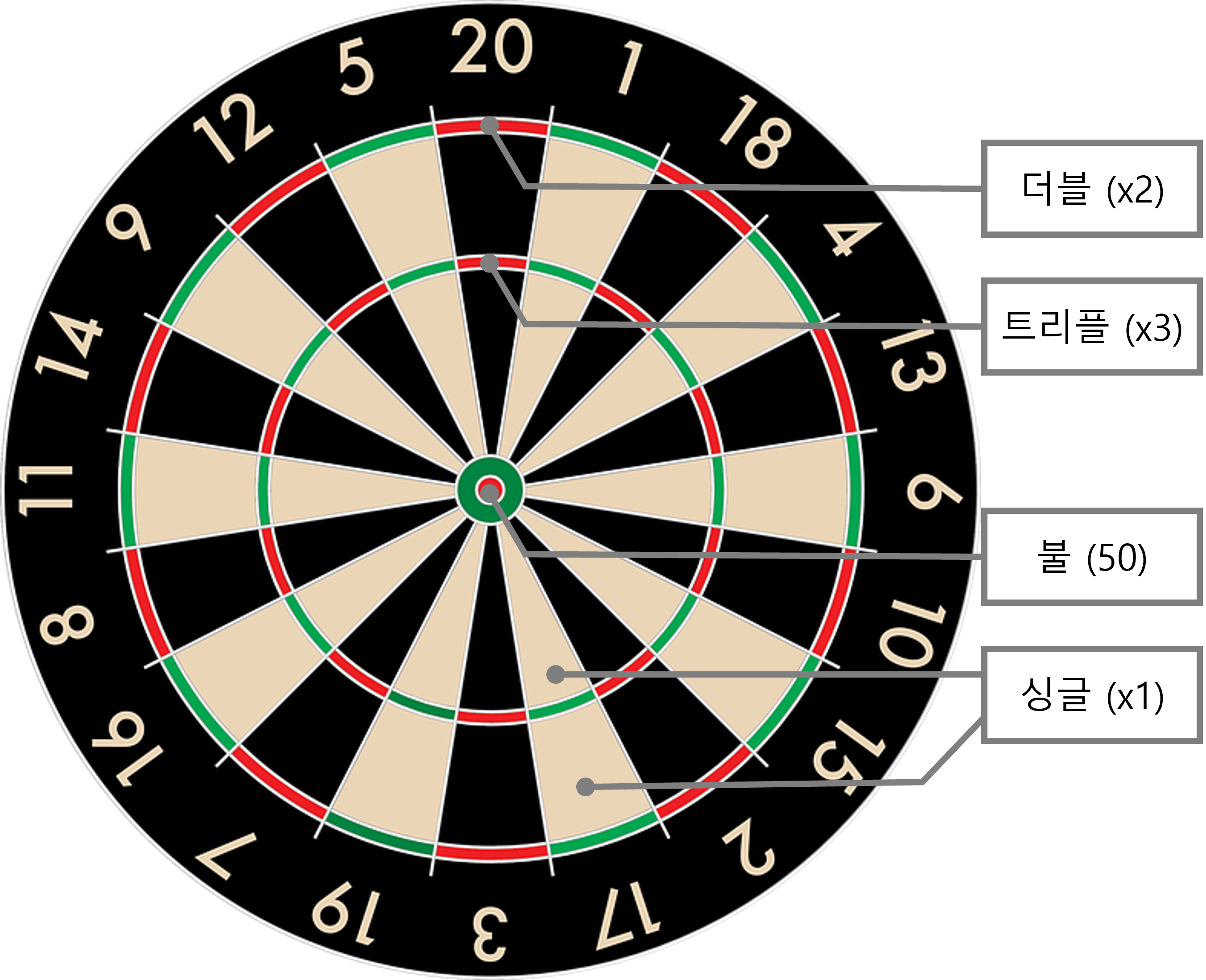 - 싱글 : 다트가 해당 칸에 꽂히면 해당 하는 점수를 획득