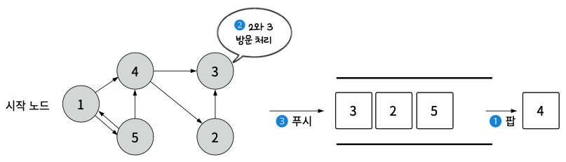 - 현재 방문한 노드와 직접 연결된 모든 노드를 방문할 수 있어야 함.