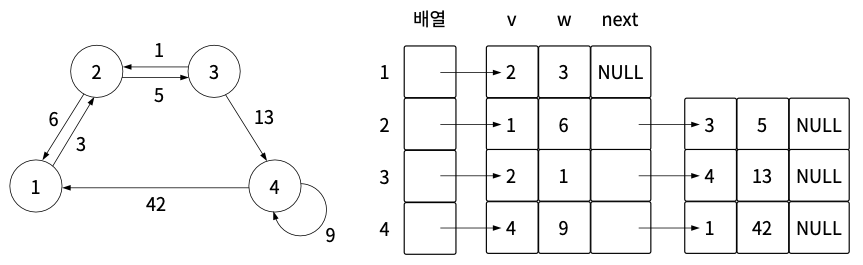 인접 리스트로 그래프를 표현하려면 정점(v), 가중치(w), 다음 노드(next)를 묶어서 관리함.