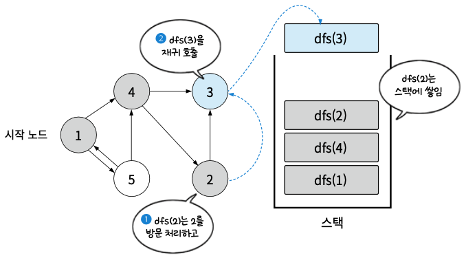 - dfs(2)를 실행. 2를 방문 처리하고 dfs(2)는 dfs(3)을 재귀 호출