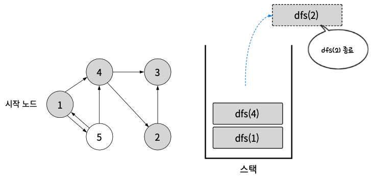 - 스택 특성에 의해 dfs(2)로 돌아가 다음 실행 스텝을 진행. 그러나 2는 인접 노드가 없으므로 종료