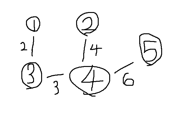 먼저 정점 번호가 주어지고, 이어서 연결된 간선의 정보를 의미하는 정수가 두 개씩 주어지는데, 하나는 정점번호, 다른 하나는 그 정점까지의 거리이다. 예를 들어 네 번째 줄의 경우 정점 3은 정점 1과 거리가 2인 간선으로 연결되어 있고, 정점 4와는 거리가 3인 간선으로 연결되어 있는 것을 보여준다. 각 줄의 마지막에는 -1이 입력으로 주어진다. 주어지는 거리는 모두 10,000 이하의 자연수이다.