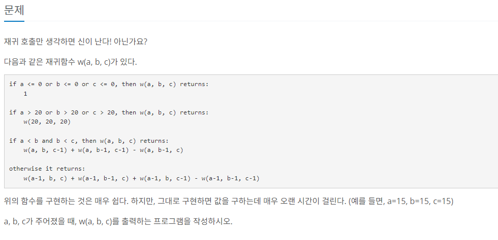 일단 바로 리턴하는 함수를 먼저 정의를 하였다. 변수들 중 하나가 0 이하가 입력받으면 1을 리턴, 20을 초과하면 a,b,c =20 을 입력받아서 바로 리턴하였다.